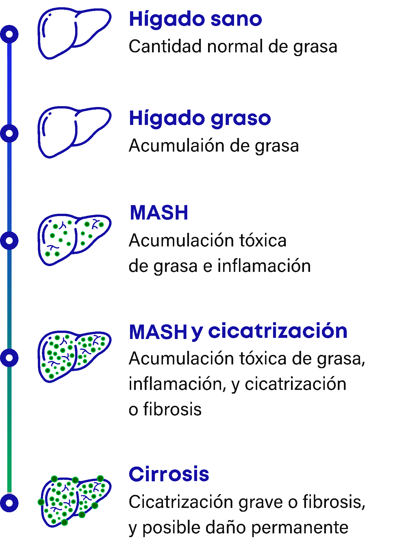 Si no detectamos y no manejamos la MASH durante demasiado tiempo, puede cicatrizar y dañar el hígado, dejándolo en riesgo de tener problemas de salud graves. Por lo tanto, hágase la prueba si cree que puede tener MASH.Vea cómo progresa la MASH